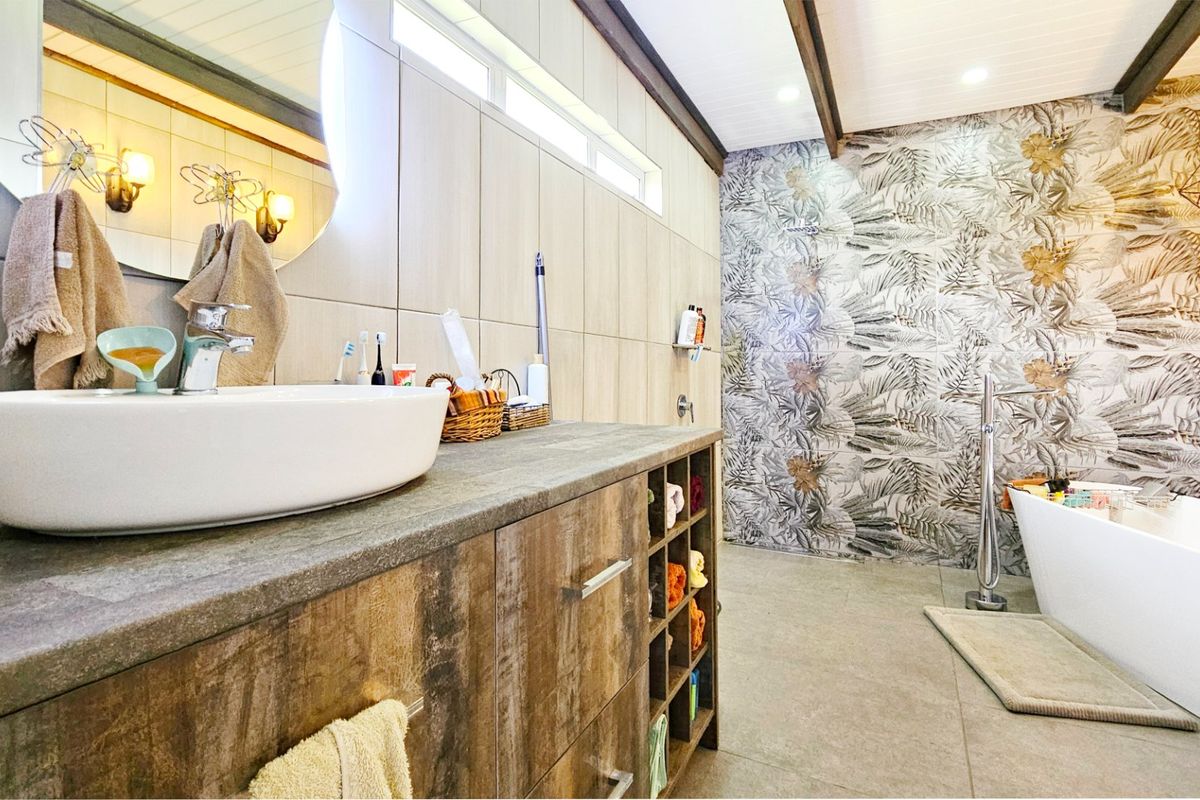 Accommodation is surprisingly generous, comprising a large lounge with a fireplace and laminated wood flooring, a large dining room that is open-plan to a lovely kitchen with a five-ring gas hob, three bedrooms (the master bedroom with space for a pyjama lounge with exposed beams and a hobby room), and two contemporary bathrooms with ambient lighting in the en-suite).