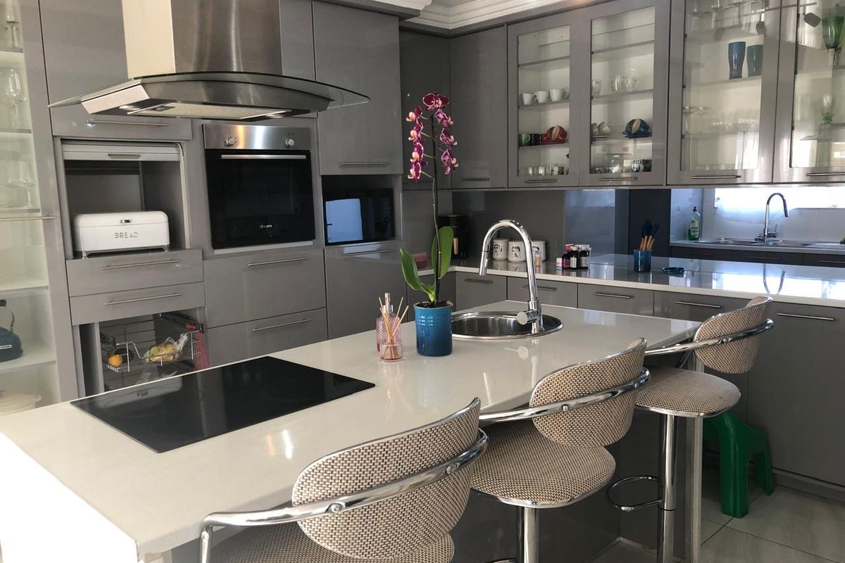 The entrance leads into spacious and well-appointed reception rooms, which flows onto an entertainers patio with braai. The well appointed, modern kitchen with center island boasts with an electric hob, electric oven, extractor fan and granite tops. There is a separate breakfast nook, a scullery and laundry area. The ground floor also a guest cloakroom and a separate guest bedroom with en-suite full bathroom.