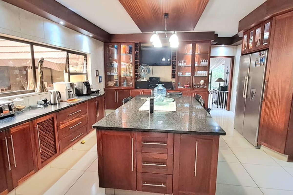 Entertainer’s retreat on 2,166 m² with Harvey thatched lapa and heated pool, mahogany gourmet kitchen with massive island, solar-powered systems and triple garage—four bedrooms, two baths.