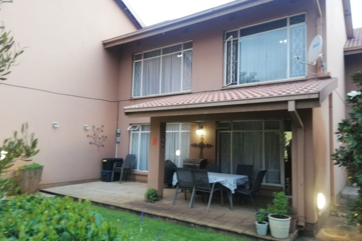 Entertainer's garden with built‑in braai and double electronic garage in a well‑located suburban setting; immaculate, spacious rooms with en‑suite plus guest toilet — three bedrooms, two bathrooms.