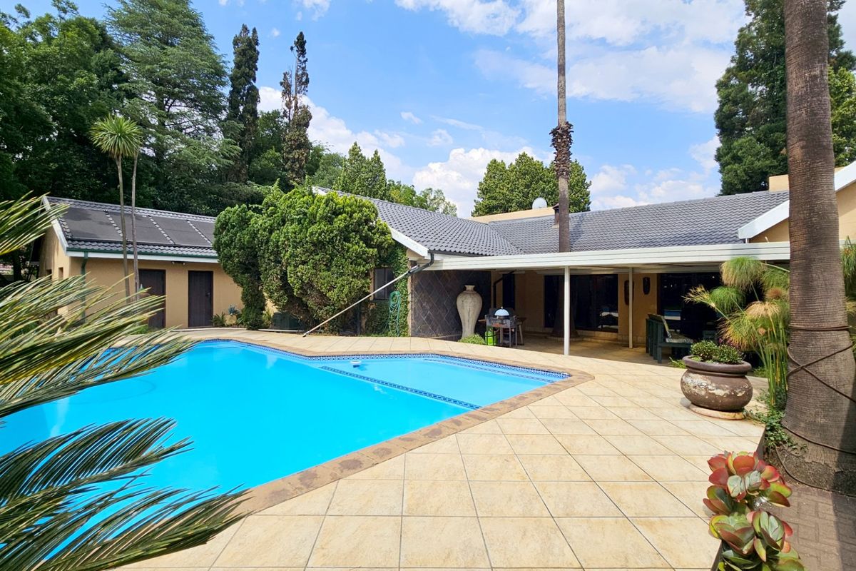 Accommodation is exceptionally spacious comprising three large living areas, a modernised kitchen with an island unit five-ring gas hob, double electric ovens and a separate scullery, four bedrooms (all with sliding doors opening up onto the pool area), three bathrooms, a sauna room with a jacuzzi and shower facilities as well as an enticing indoor entertainment room with a fitted bar and a fitted braai, flowing out onto the patio via aluminium stacker doors.
