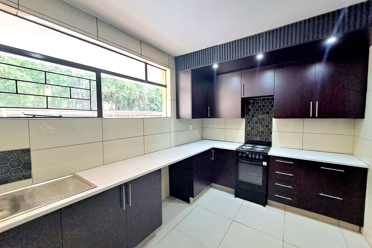 Step into a modern, well-sized kitchen with ample cupboard space, flowing seamlessly into the dining area and lounge. Beautiful parquet flooring adds warmth and timeless charm throughout the living space.