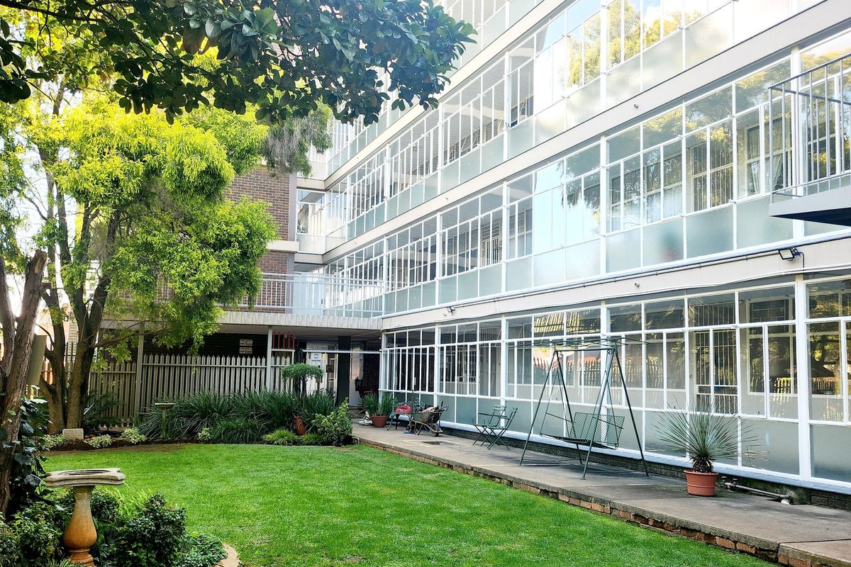 Sunlit apartment for relaxed, social living in a peaceful, leafy complex, featuring an enclosed balcony and communal garden with thatched seating. Two bedrooms, two bathrooms, plus a garage.