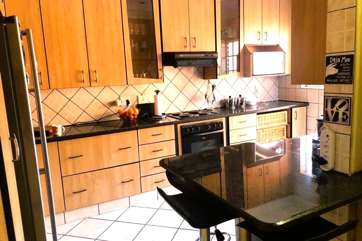 The living areas are open plan, with a comfortable lounge and dining area that create the perfect space for relaxed family living or entertaining. The modern kitchen includes a breakfast nook, granite countertops, ample cupboard space, an electric stove with extractor fan, space for a double-door fridge, as well as a classy built-in beverage display cabinet that adds a touch of sophistication.