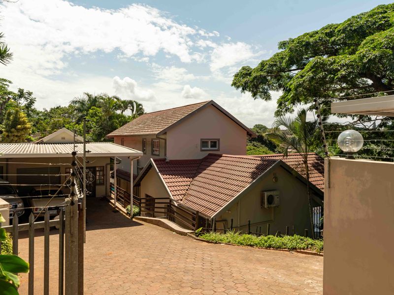 Entertainer's coastal retreat in Amanzimtoti with a large wooden deck and built-in braai overlooking a manicured garden — includes a self-contained flat, four bedrooms and three bathrooms.