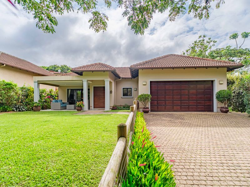 Tropical coastal retreat on Ballito’s Dolphin Coast, close to beaches and golf, with a full-width covered veranda overlooking a lush garden—three bedrooms, two bathrooms, lock-up parking.