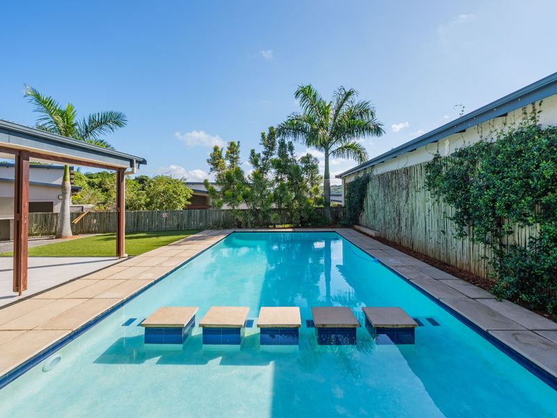 Resort-style family living minutes from beaches and country club, low-maintenance courtyard, private pool, home office and bar; three ensuite bedrooms, full-house ducted AC and double garage.