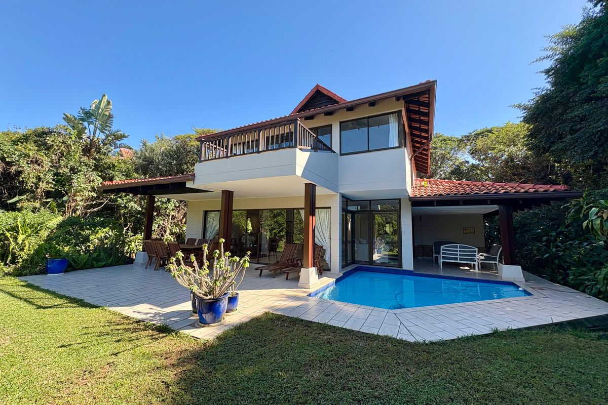 Coastal lifestyle in Zimbali Coastal Estate with private pool and forest/ocean views, seamless indoor-outdoor living; three en-suite bedrooms, 3.5 baths and double garage.