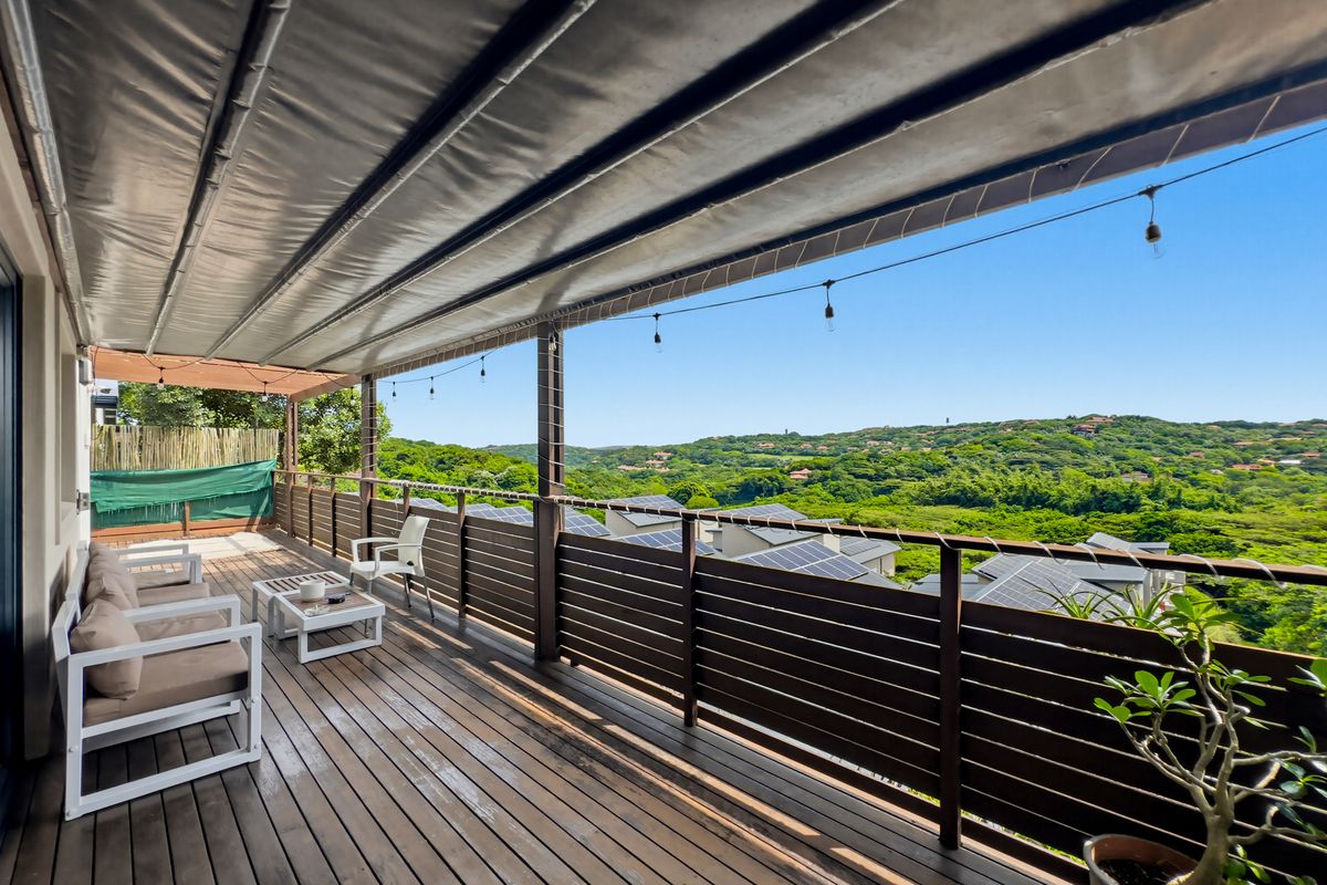 Serene forest-valley living in Ballito, with light-filled interiors and a covered deck featuring a retractable roof for year-round entertaining. Three bedrooms, three bathrooms, double garage.