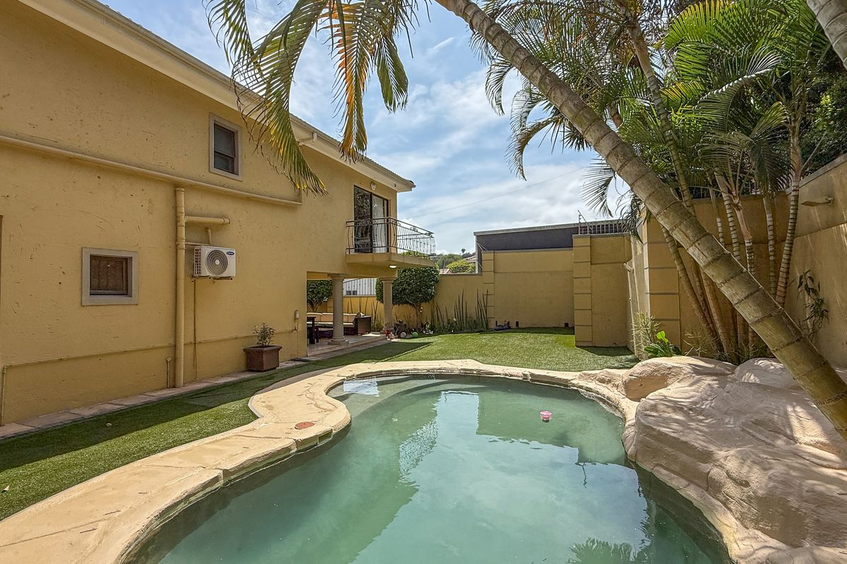 Entertain effortlessly in Ballito’s heart — a designer home with double-volume stained-glass entrance, chandelier and water feature, covered braai patio, sparkling pool and four en-suite bedrooms.