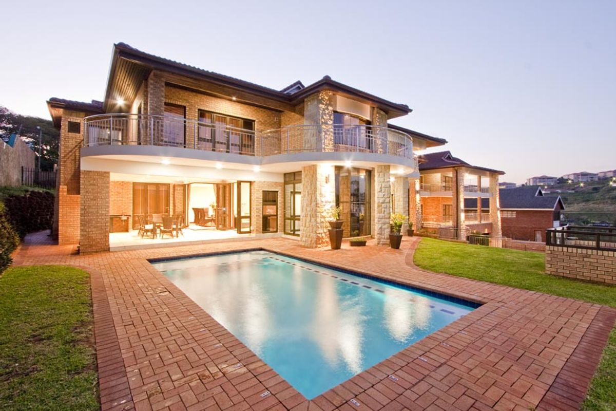 Coastal family living on the Dolphin Coast, 1.6km to Ballito beach — wide covered terrace overlooks a secluded pool and immaculate garden with jungle gym; six bedrooms, six ensuites.