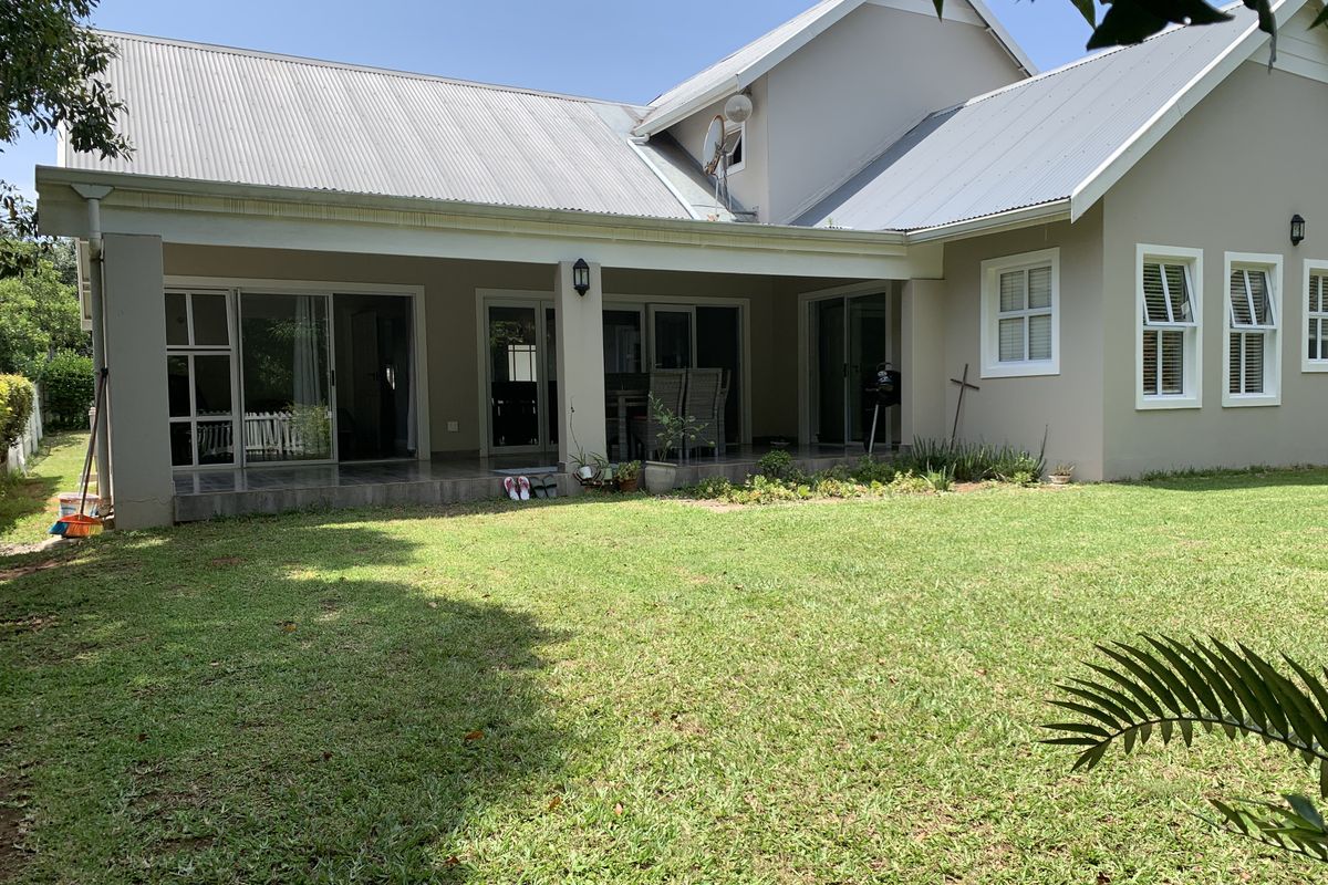 Exclusive Sole Mandate : This awesome cottage-styled home offers open-plan living and dining with granite-topped fitted kitchen and great storage. Step from the living area via concertina doors and enjoy the large covered patio overlooking the pretty level enclosed garden, and greenbelt beyond. Ideal for young children and pets. The main bedroom with fitted aircon & fan, has access to the patio, full en-suite bathroom and dressing room. 2 smaller bedrooms with ceiling fans share a shower room. Fitted linen cupboard, aluminium sliding doors and windows, tiled throughout, a large double auto garage with laundry facilities & storage are extra features. Plus a fantastic upstairs studio with balcony & en-suite shower. Perfect for teenagers, home office or play-room. Communal estate pool and 24/7 security access. Schools and country clubs on your doorstep with sport and recreational facilities close by. A 5 minute drive to all amenities, main routes and 20 minutes to King Shaka airport.