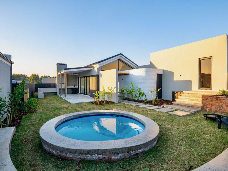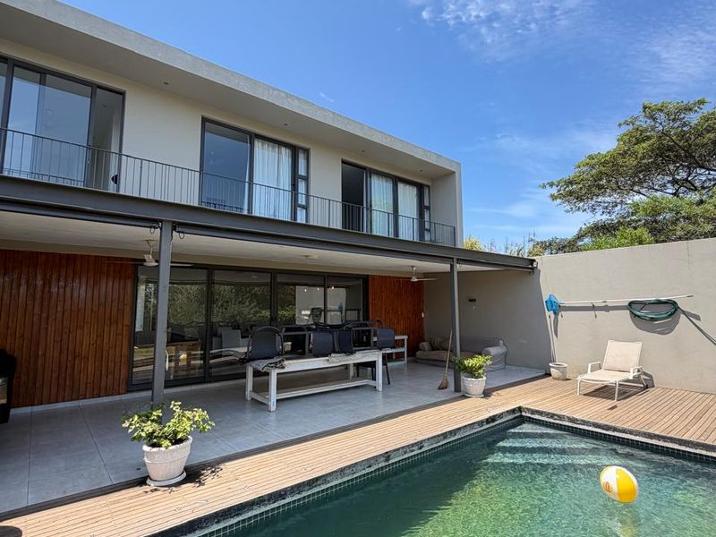 Coastal-forest living at Elaleni Coastal Forest Estate, steps from an exclusive beach hangout; open-plan home with pool and veranda for braais. Four bedrooms, three bathrooms, double garage.