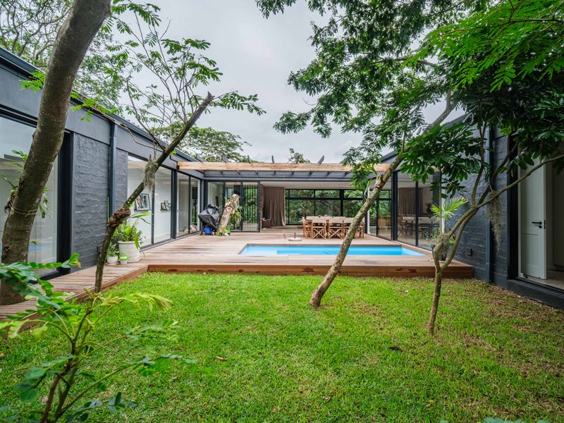 Relaxed Ballito North Coast forest living in Elaleni Coastal Forest Estate with seamless indoor-outdoor flow onto a covered veranda and private pool; four bedrooms, 2.5 bathrooms and double garage.