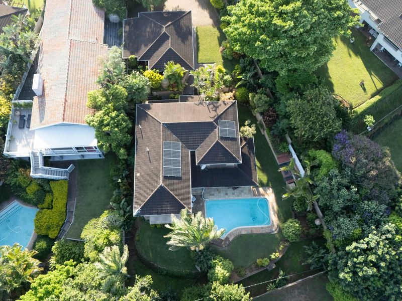 Walk to Salt Rock Beach from this spacious family home with sweeping sea views, L-shaped veranda and pool, manicured garden, solar backup and robust security — 4 beds, 2.5 baths.