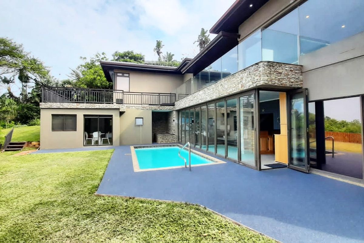 Luxurious five-bedroom home with sea views, modern amenities, pool, and spacious living areas in a secure Dolphin Coast estate.
