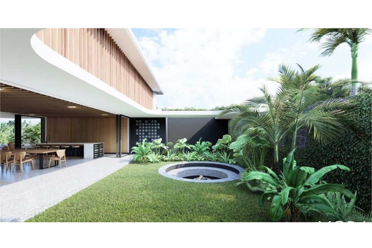 Central Courtyard: Private internal garden with lush landscaping and firepit feature, seamlessly connecting to the living and dining areas.