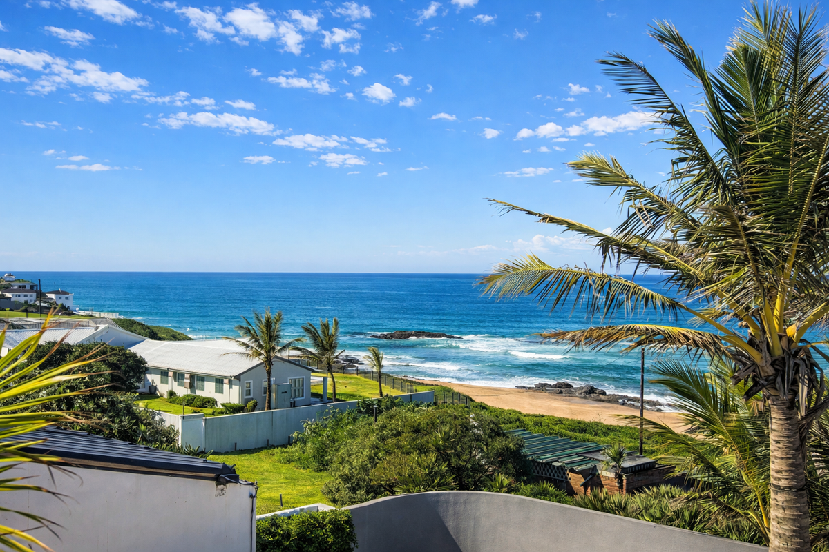 Wake to ocean views and beachfront living in Tinley Manor, Ballito North Coast; rooftop terrace, pool and built-in braai — four en-suite bedrooms plus double garage.
