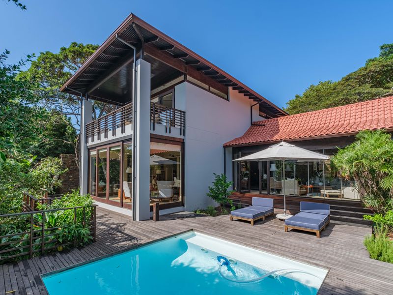 Resort-style coastal living in Zimbali Estate with private garden, pool and entertainment patio; oversized main suite with balcony, modern kitchen and scullery — five bedrooms, double garage.