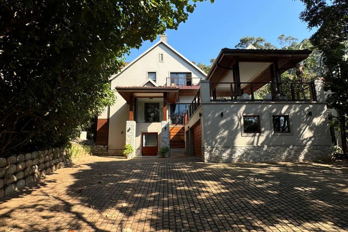 This exquisite home is tucked away in a serene cul-de-sac within the prestigious Zimbali Estate. Upon entry, a grand staircase welcomes you, leading into the expansive open-plan living area. The layout is designed to maximize space and natural light, creating a warm and inviting ambiance. The space seamlessly integrates the dining room, kitchen, and TV lounge, making it perfect for both everyday living and entertaining. For a more relaxed vibe, an informal lounge with a built-in braai opens directly onto the pool and patio, ideal for outdoor gatherings.