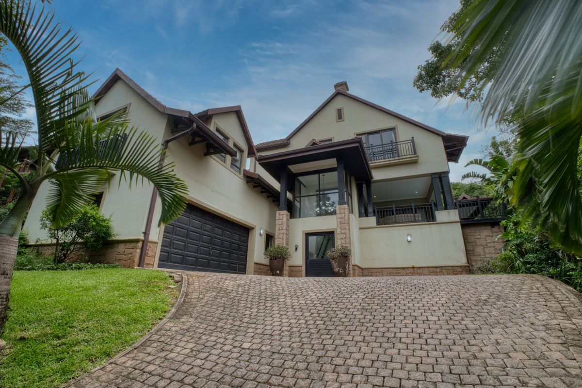Secluded forest retreat in Zimbali Estate with double-volume entrance and seamless indoor–outdoor flow, private decks and entertainment area with built-in braai and splash pool; four en-suite bedrooms, double garage.