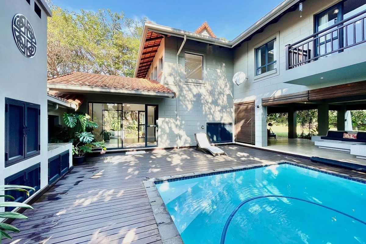 Resort-style family living in Zimbali Estate, set above the 18th fairway with private pool courtyard and a glass-wrapped entertainment room — four bedrooms and covered parking for four.