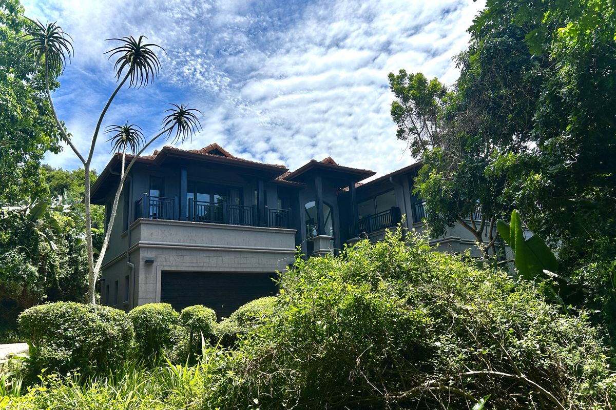 Live in Zimbali's indigenous forest with Indian Ocean breezes, seamless indoor–outdoor living through stackable glass doors, beach-style fireplace and gourmet kitchen; five bedrooms, 5.5 baths, triple garage.