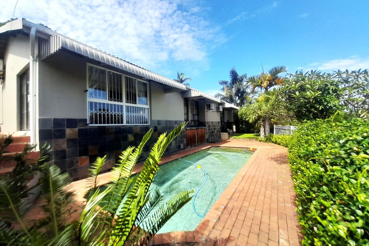 Host effortless gatherings in leafy Umgeni Park, Durban North, with tropical gardens and a sparkling pool. Includes private flatlet, parquet floors and three bedrooms, 2.5 baths.