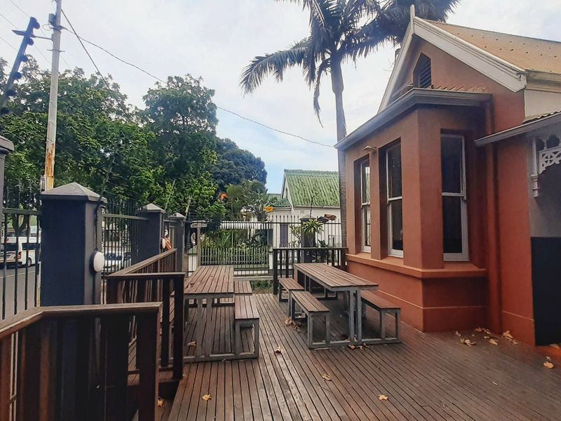 Vibrant street-front hub in Durban’s busiest suburb, with dual access, fully equipped sushi-and-pizza restaurant, 40 sqm road-facing dining deck, and a two-story office suite with seven offices.