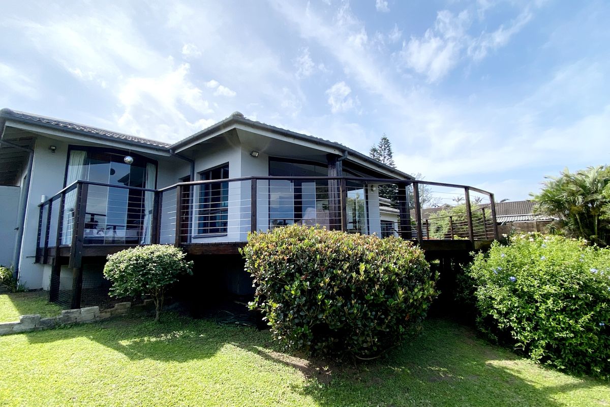 Coastal living steps from the beach in quiet Elysium, 70 km south of Durban — open-plan home with modern kitchen, private wooden deck with glass stacking doors. Three bedrooms, two bathrooms.