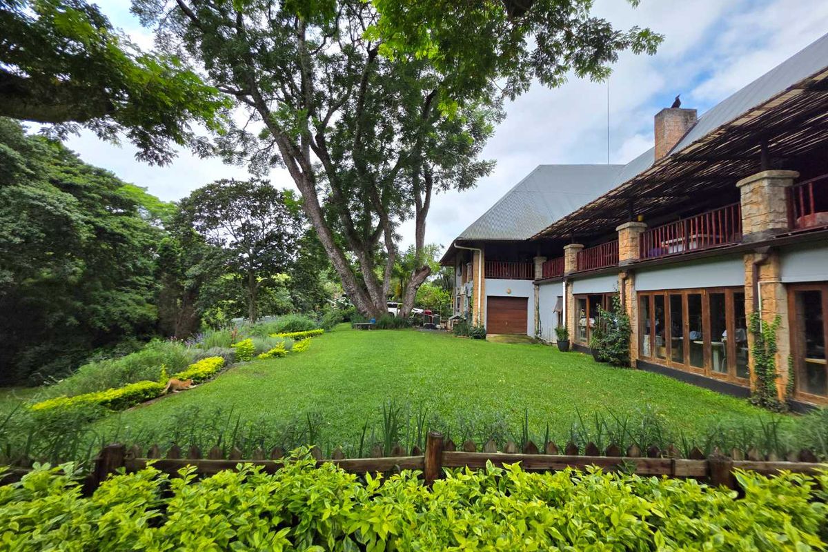Lodge-style retreat in Maytime/Kloof Golf Course SRA, set among mist-belt gardens with a koi-pond entrance and timber interiors—three en-suite bedrooms, double garage, dual-living wing.