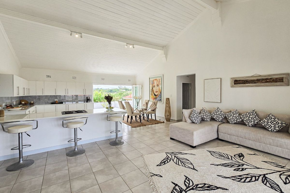 Seaside entertaining in Manaba Beach with open-plan living, high ceilings, sea-facing bedrooms, private flatlet and pool with built-in braai. Three beds, two baths, double garage.
