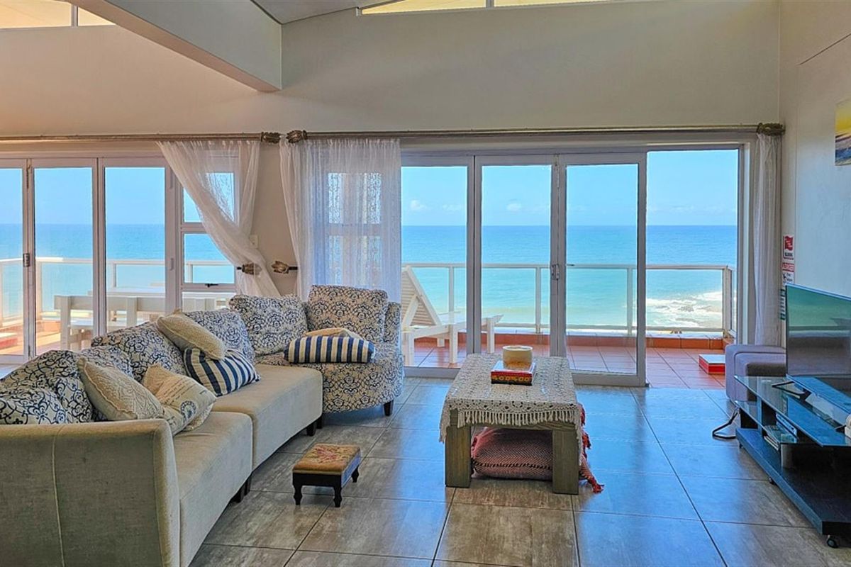 Delightfully luxurious, this executive, 4 bedroom penthouse is in the southern part of Margate, bordering Ramsgate. Quiet and peaceful with DIRECT ACCESS TO THE BEACH!!! The penthouse has an uninterrupted, 180 degrees view of the MAGNIFICENT, BLUE OCEAN! The moment you enter the SUPER SPACIOUS open area of the lounge/ dining room / kitchen, the OCEAN welcomes you with it`s magnificence, and BLUE BEAUTY. The interior of the penthouse has been professionally and elegantly designed and is infused with a vibe of luxury and sophistication. High end furniture and finishes create a lavish, yet minimalistic atmosphere throughout the penthouse. Ultimately bright, light and airy, the living and dining area has high windows that allow even more light in. The penthouse is sold AS IS, with all the furniture AND appliances included in the sale...almost brand new and of brilliant quality. The lounge and dining room area has stackable glass doors that opens the whole corner of the space to an absolute HUGE, cornet balcony, blending naturally with the outdoors and the OCEAN. This exceptional balcony has unbeatable sea views. There is a jacuzzi in the corner of the balcony where you can relax/ entertain and enjoy the view, smell and sound of the sea. In fact it almost feels like you can TOUCH the ocean! This design invites the ocean RIGHT INTO YOUR HOME. The kitchen is a modern, open plan delight with granite countertops with a kitchen island with a stove. BEAUTIFUL...SIMPLY STUNNING! This design not only allows for a beautiful cooking environment, but also allows the cook to enjoy close-up sea views while preparing your meals. The kitchen has a lovely scullery/ laundry which is great, as you can close the door on dished and laundry.