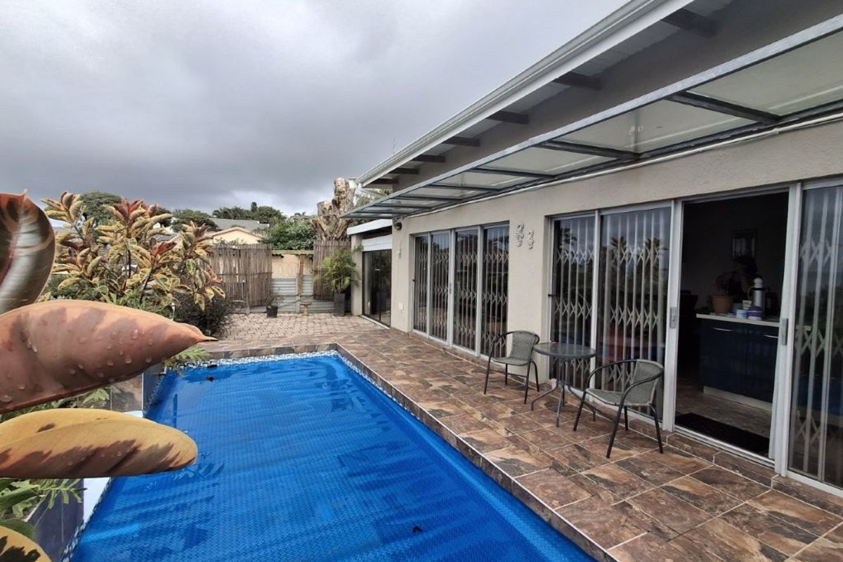 This spacious family home, situated in St Michaels, with amazing ocean views offers everything you need for comfortable coastal living with a lucrative rental income. As you enter the main house, into a welcoming entrance hall, you will find on the right wing, 3 spacious bedrooms and 2 modern bathrooms, the main bedroom, with an abundance of cupboard space, has the bathroom en-suite and a second bathroom, strategically placed, caters for the 2 remaining bedrooms. There is also a homely TV room with a feature fireplace, offering you cosy private evenings. The left wing of the home gives you open plan living, with a large lounge, informal dining and a beautiful modern kitchen with top of the range cabinetry and sleek granite work surfaces. These areas flow, through double volume sliding doors, to an outside patio and pool area with beautiful views over the Indian Ocean. To the right of the patio there is an enclosed entertainment area, with a built-in braai, so come rain or sunshine entertaining is a breeze.