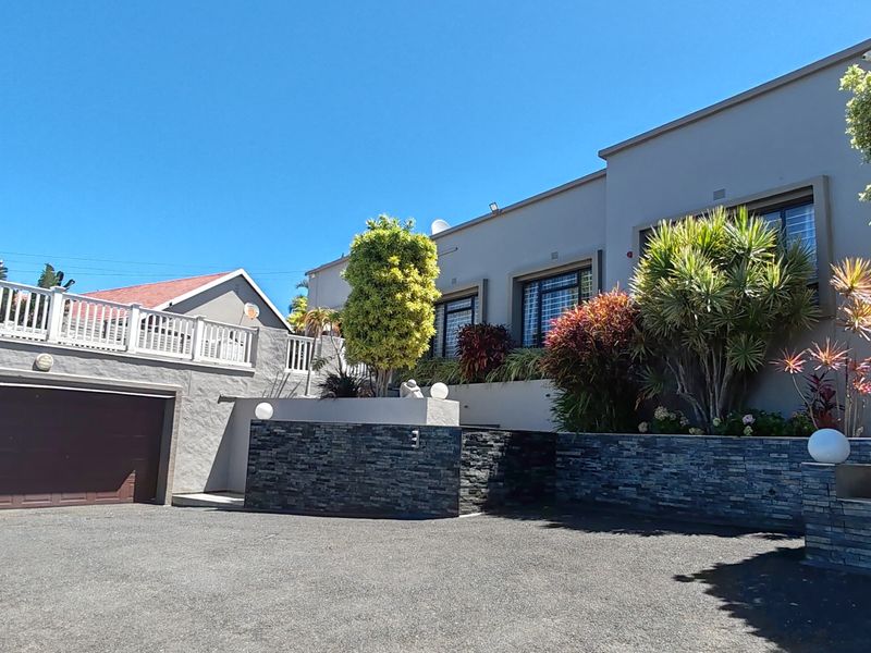 Coastal family entertainer offering sunlit open-plan living, poolside balcony with built-in braai and sweeping sea views, mature garden and a modern kitchen—five bedrooms, three baths, double garage.