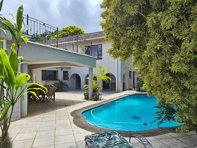 Coastal family living in Uvongo, Margate — expansive 1,650m² garden with a separate flatlet and balcony for guests; five bedrooms, three bathrooms and two single garages.