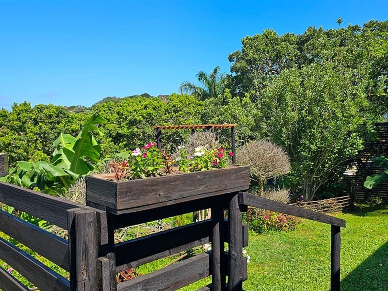 Escape to coastal Uvongo living in a private, farm-like garden with banana, lemon and apple trees; open-plan renovated kitchen, huge wooden deck overlooking pool. Four bedrooms, two bathrooms.