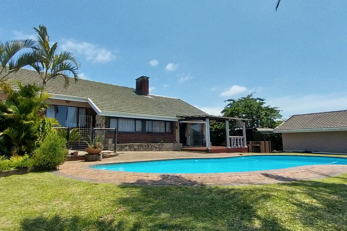 Sole Mandate ! This charming family Home in Uvongo. The property is fully walled with a spacious garden, ideal for beloved pets, along with a generously sized swimming pool, and a small distant sea view. Upon entering, you will find two distinct lounge areas connected by archways to the dining room. One lounge includes a cozy fireplace, while the second lounge opens onto a spacious entertainment deck that overlooks the pool and features a built-in braai area.
