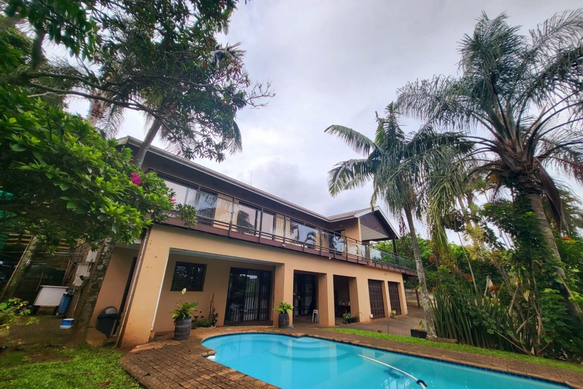 Downstairs is a large self-contained flat with 2 bedrooms, 1 bathroom, kitchen, lounge, dining area with sliders to the covered patio overlooking the pool. At the rear of the property is a large, thatched entertainment area, with bar and built-in braai, this could serve as a covered parking as well. Up a flight of stairs is the self-contained flat with bedroom, bathroom, kitchen and lounge, opening to enclosed sunroom with built in braai.