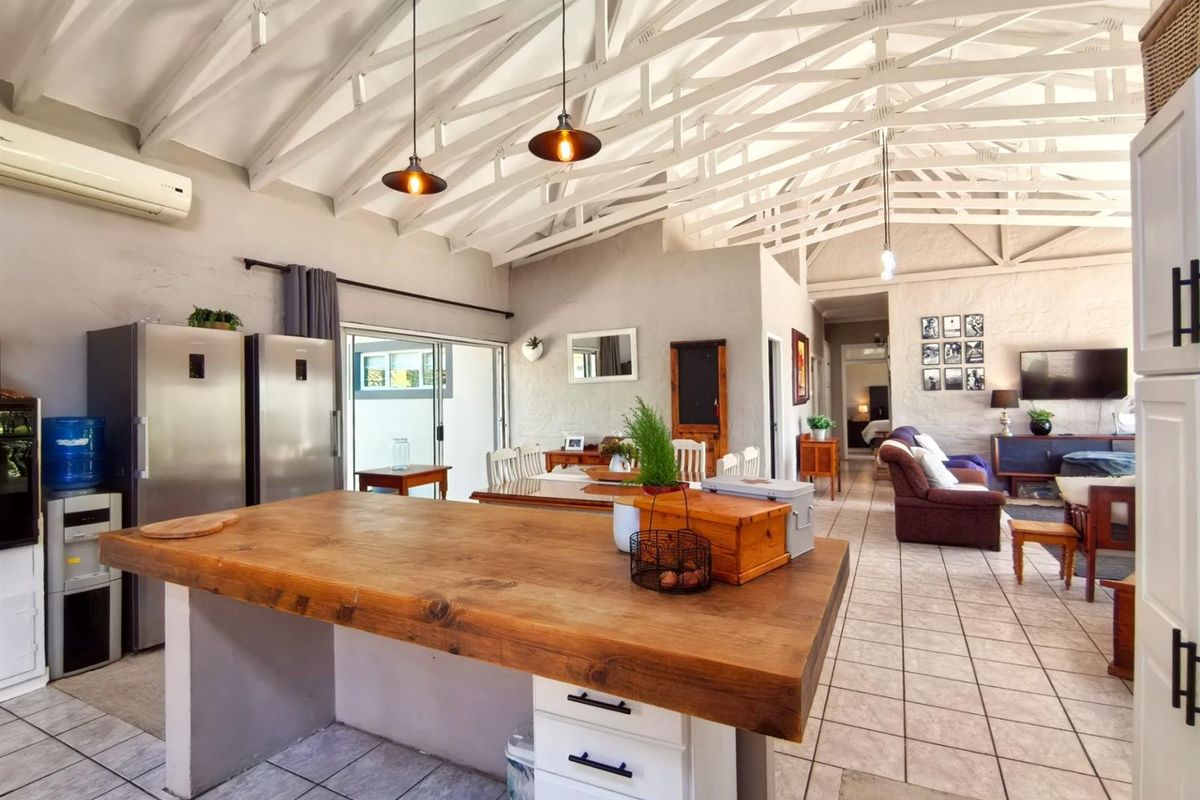 The open-plan living area combines a lounge, dining room, and kitchen, enjoying exposed beams, a solid wood kitchen island, and large windows that flood the area with natural light.