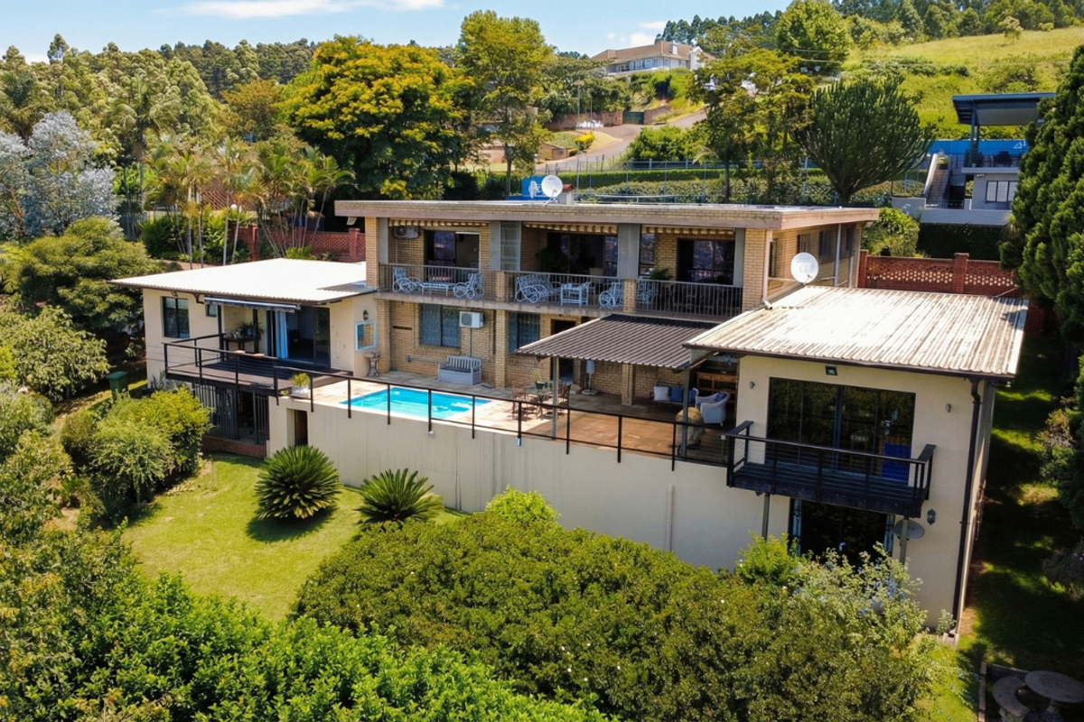 Entertainer's dream on elevated Tanner Road, offering sweeping 180° Pietermaritzburg views and expansive deck with private heated pool and bar, plus separate flatlet and four bedrooms.