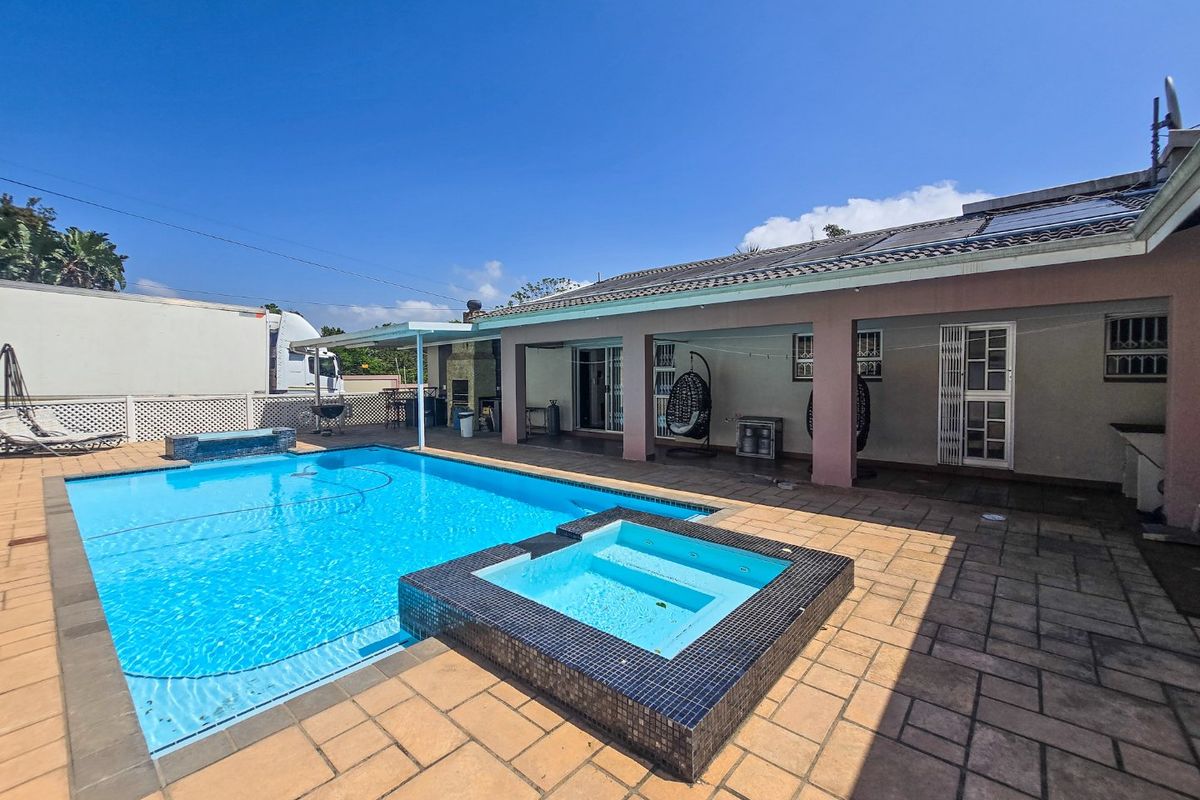 A double automated garage provides secure parking. For safety, the property has CCTV, an alarm, perimeter beams, and an electric fence. Outside, enjoy a large heated pool with a built-in Jacuzzi area. JoJo tanks are connected.