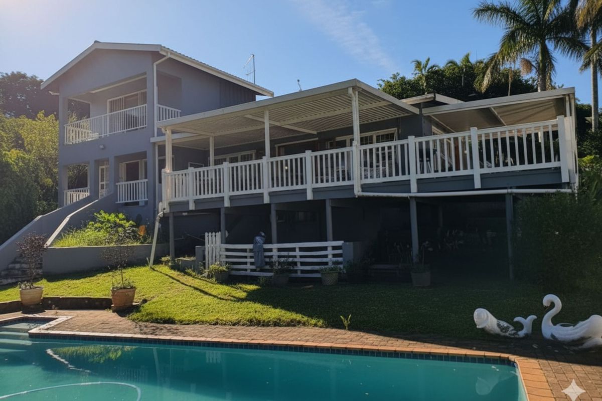 Coastal living in Pumula, KwaZulu‑Natal with direct beach access and a magnificent patio boasting panoramic ocean views — modern kitchen, three bedrooms, two bathrooms and single garage.