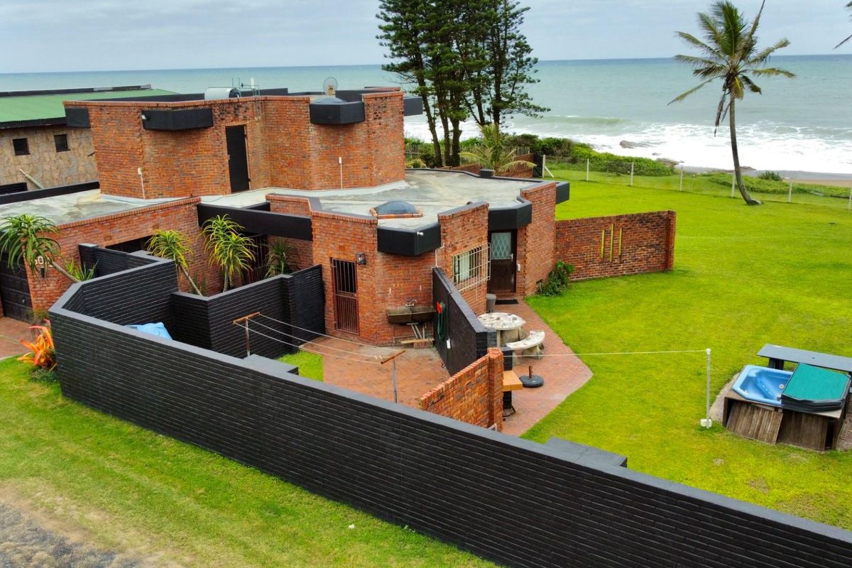 Direct beachfront lifestyle with endless ocean views and lawn flowing to the sand; architect-designed home features a braai/jacuzzi entertainment area and four bedrooms, four bathrooms, double garage.