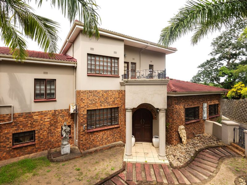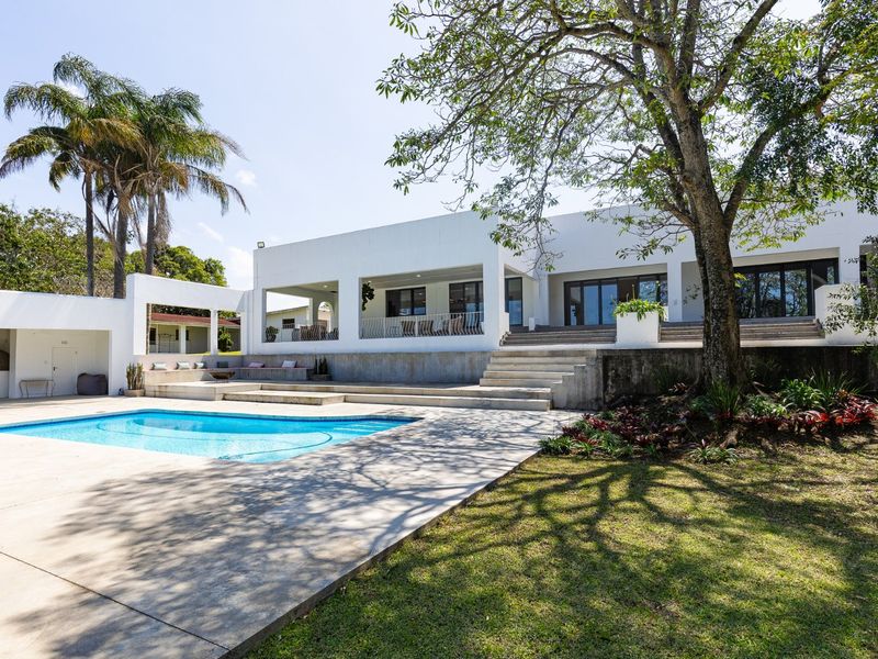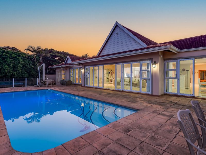Flexible family living and rental potential in leafy Umtentweni, featuring two separate homes, a covered entertainment area overlooking a lush garden, seven beds, three baths, double garage.