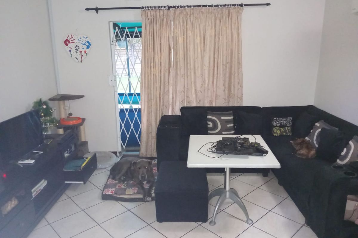 Each of the three bedrooms is designed for comfort, with tiled flooring and neutral walls ready for personalization. The main bedroom includes an en-suite bathroom and benefits from natural light, featuring security bars on the windows for added safety. Cooling options, including an AC unit and ceiling fan, are present in one of the bedrooms, catering to the local climate. It includes one dedicated parking space.