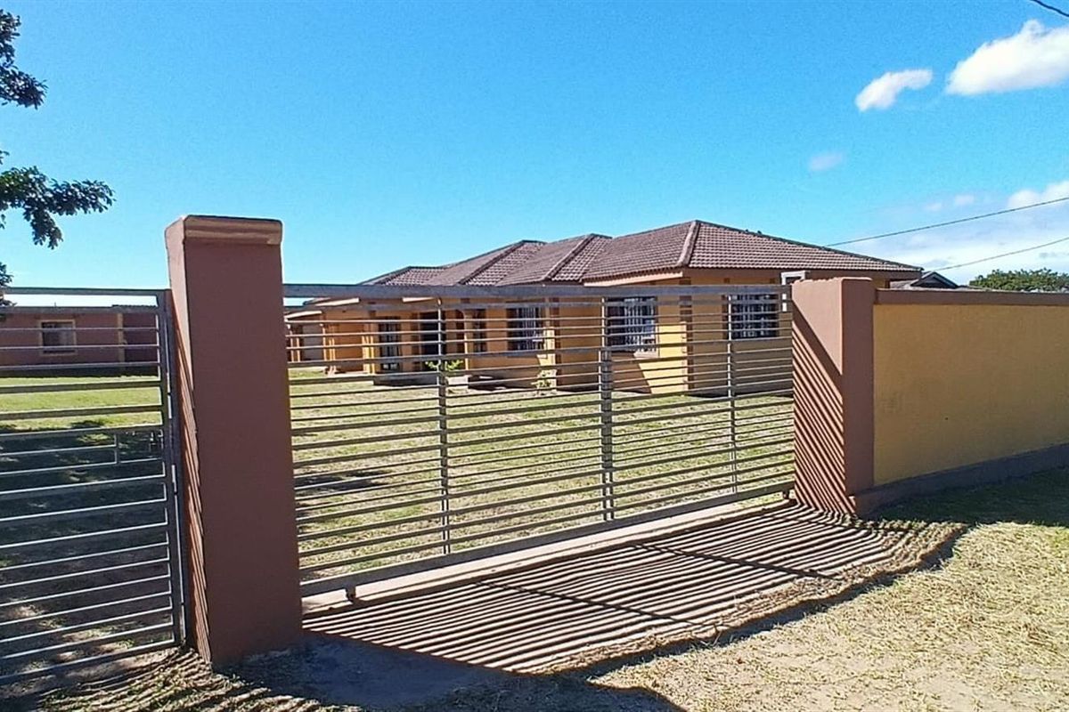 Relaxed family living in Mandlazini, Richards Bay with an expansive fenced yard and outdoor patio — open-plan kitchen, flatlet for guests, five bedrooms, double garage.