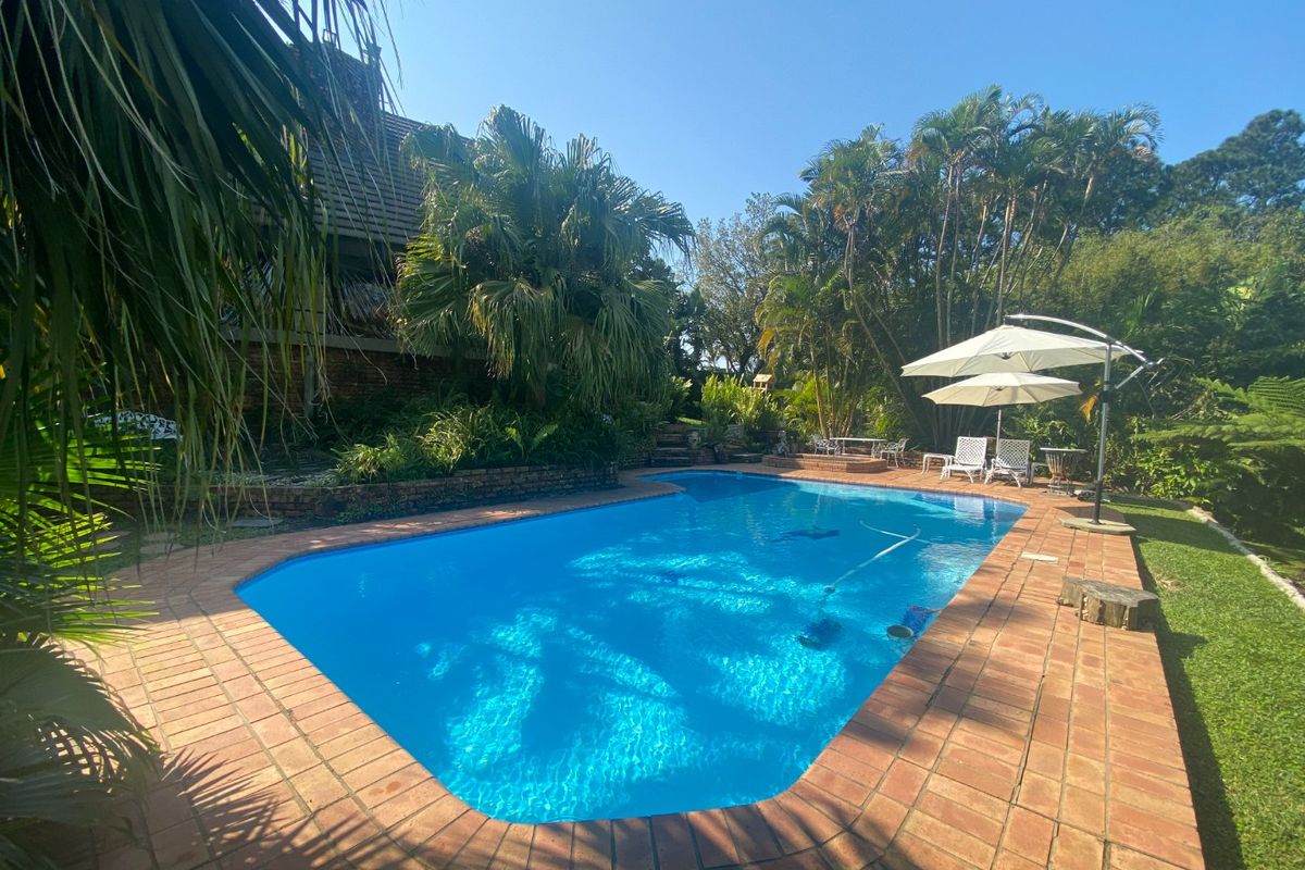 Entertainer's dream in a secluded, leafy setting, with expansive patio overlooking a sparkling pool, huge granite kitchen with scullery, five bedrooms, four bathrooms and a one-bedroom flat.