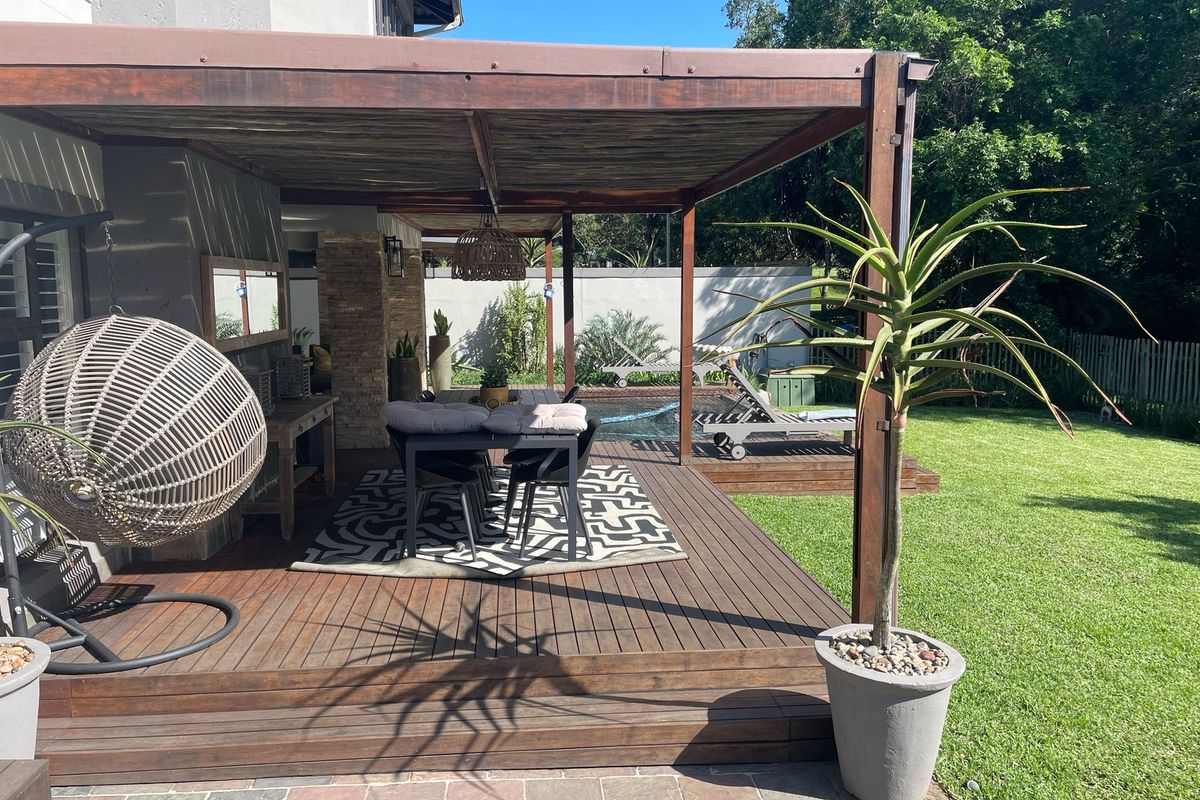 Step inside and be swept away by the open-plan living space – sleek, sunlit, and seamless – flowing effortlessly onto an expansive undercover patio with a wooden deck, overlooking a show-stopping, manicured garden and indigenous bush. Whether you're hosting guests or enjoying quiet evenings under the stars, the outdoor poolside entertainment area – complete with a built-in braai and elegant seating – is pure perfection.