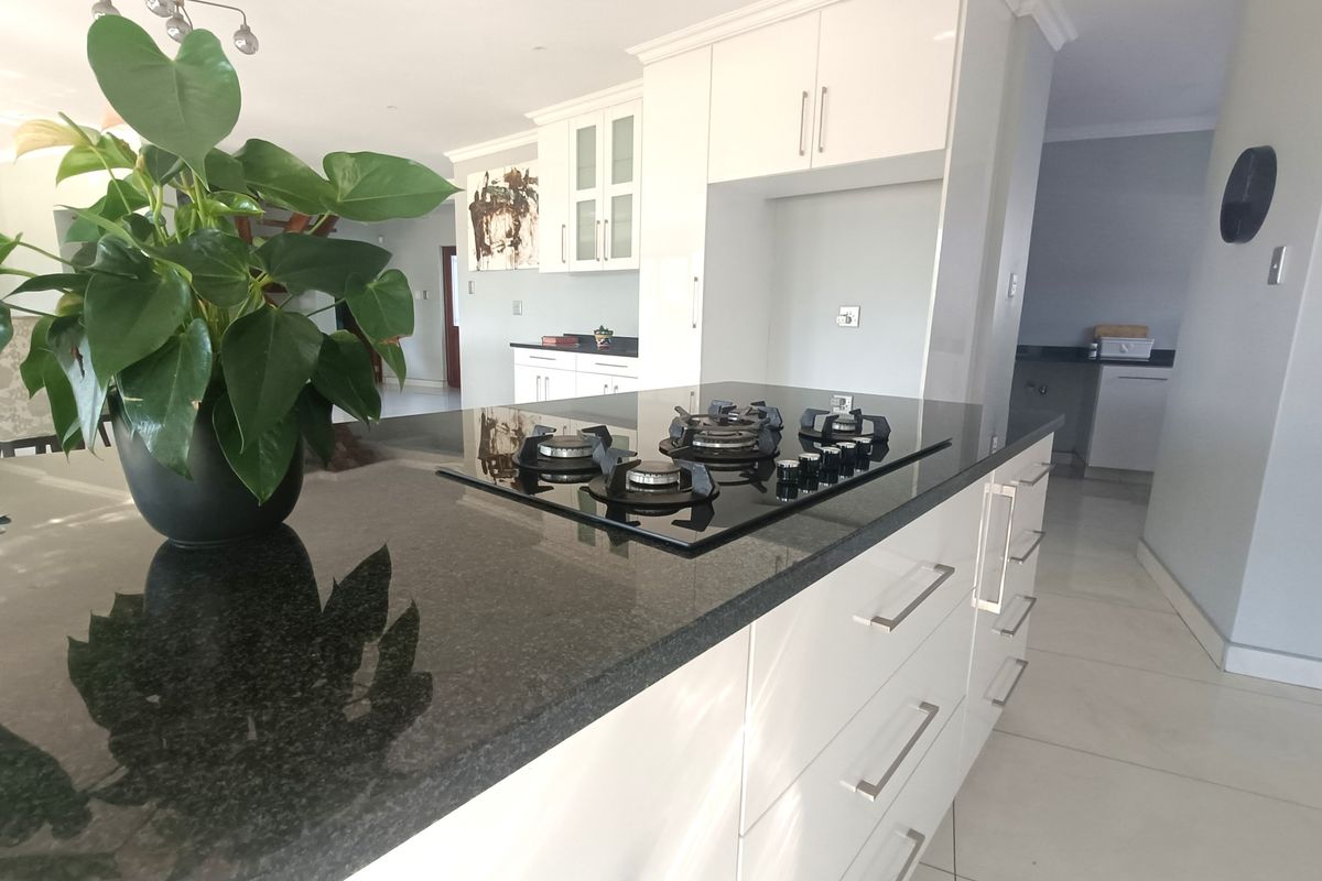 This exceptional four-bedroom home offers luxurious, spacious living in the sought-after Mzingazi Golf Estate. The ground floor boasts an expansive open-plan layout combining the lounge, dining area, and modern kitchen with granite finishes and a separate scullery for added convenience. A guest bedroom with an en-suite bathroom, as well as a separate guest toilet, ensures comfort and privacy for visitors. The living area flows out to a large patio with a built-in braai, overlooking a sparkling swimming pool and jungle gym – the perfect outdoor haven for family fun and entertaining.